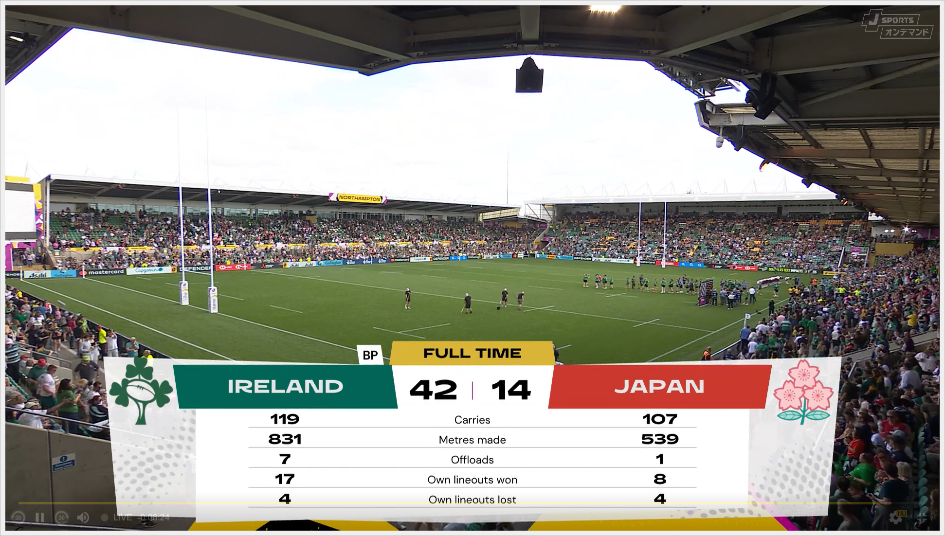 タックル成功率は96%と、ここ最近見ないような高い数値を叩き出したものの、飛車角を欠いたカナダの攻撃を考えると、これも、今後の試合にはあまり参考にならないかもしれません。それよりも、モールディフェンスに課題が残った方を問題視しないといけないのかもしれませんね。