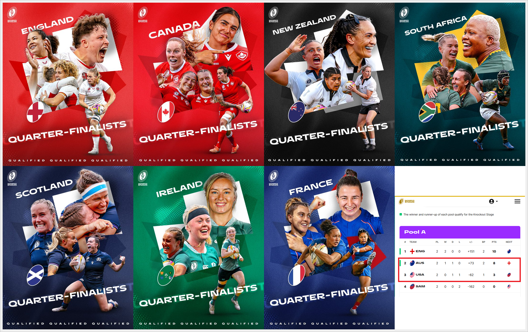 画像の7チームがノックアウトステージに行けることが決まった。残りの1枠は、POOL Aのオーストラリアかアメリカのどちらか。次の試合で両チームは恐らく勝ち点は並ぶだろうから得点差で決まるはず。だとするとオーストラリアが有利かな。