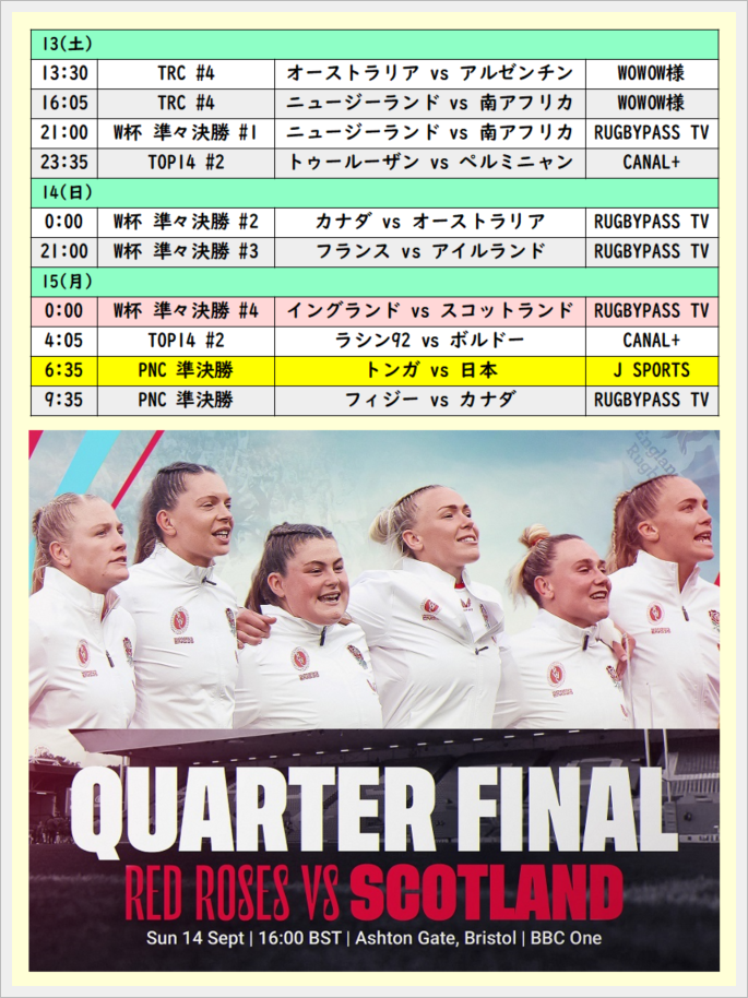 順当にいけば、決勝はカナダ vs レッドローズか。レッドローズファンとしては、前回大会のリベンジを賭けて、ブラックファーンズに勝って欲しい。とは言え、フランスも侮れない相手。