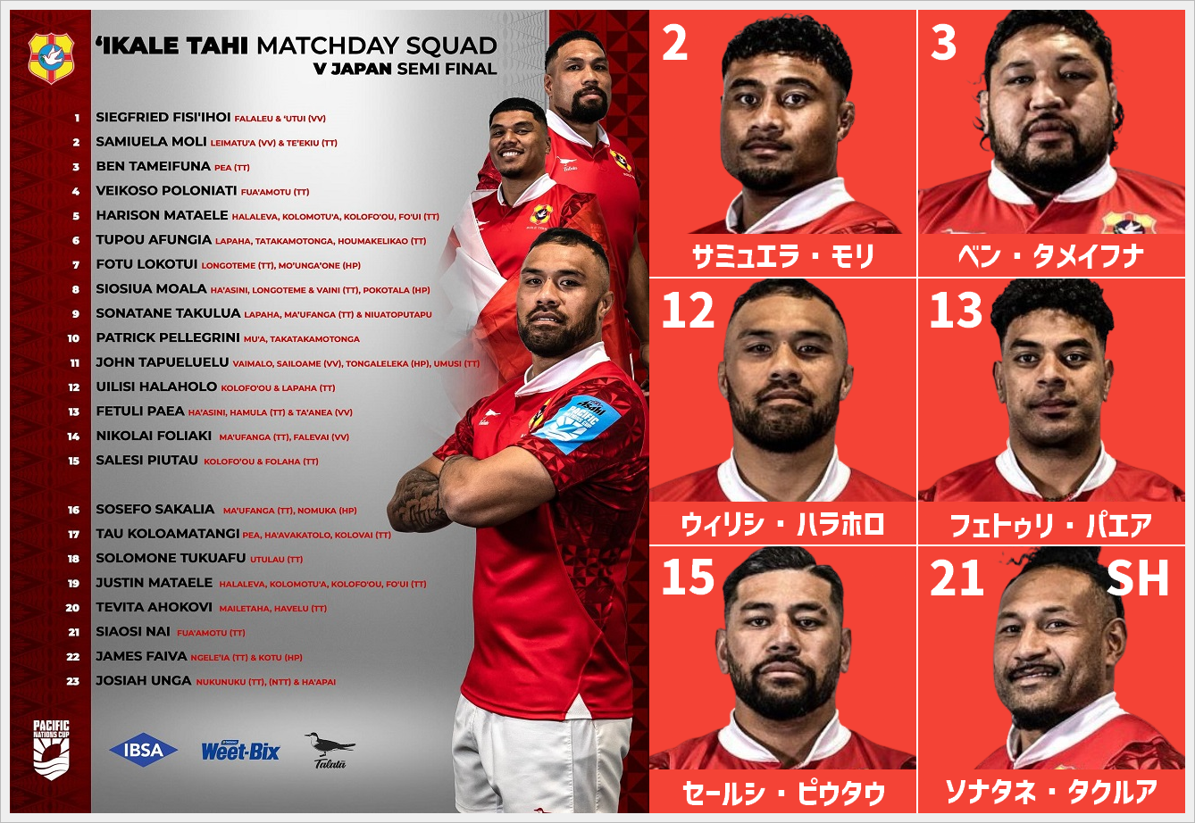 トンガのことはあまり詳しくないのですが、去年の秋のANS2試合と今年のPNC2試合を観た限りの戦い方の特徴や注目選手などをまとめてみましたので、よろしければご参考まで。本当はスタッツに基づいて書くのが良いのでしょうが、サボって個人的な印象だけで書いてますので、あしからず。