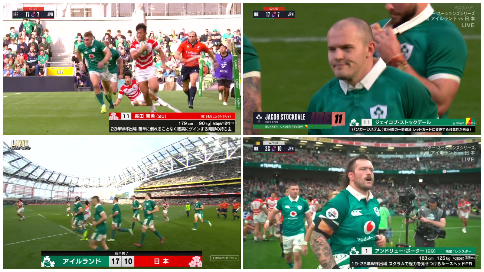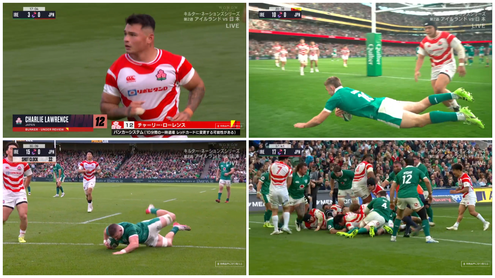試合開始3分で、アイルランドのLOバーンが頭部付近へのタックルで退場(20分レッドカード)となったにもかかわらず、アイルランドは集中力を発揮し、PRファーロングのトライなどで 10-7 のリードで折り返しました。ただアイルランドのラインアウト成功率が低く(前半60%程度)、ターンオーバーを多く許すなど細部に不安要素も見られました。