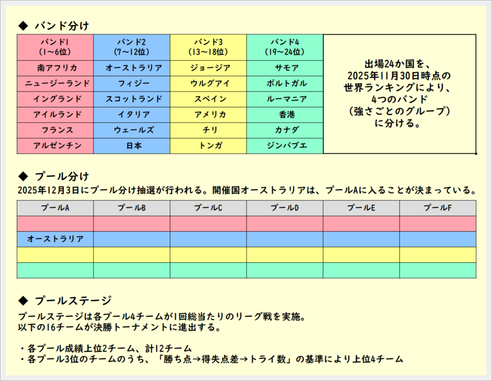 12月3日に2027年W杯のプール分け抽選会が行われます。現時点で分かっている大会形式や仕組みをまとめてみました。