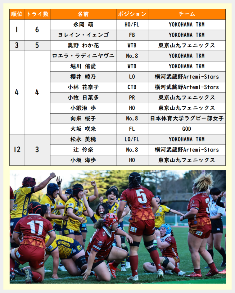やはり大会を首位で通過したYOKOHAMA TKMが目立ちますね。TKMに限らず、沢山の選手たちが代表に呼ばれるよう祈ってます。勿論、トライ数が全てではありませんので、活躍した選手たちが沢山代表に呼ばれると良いですね。