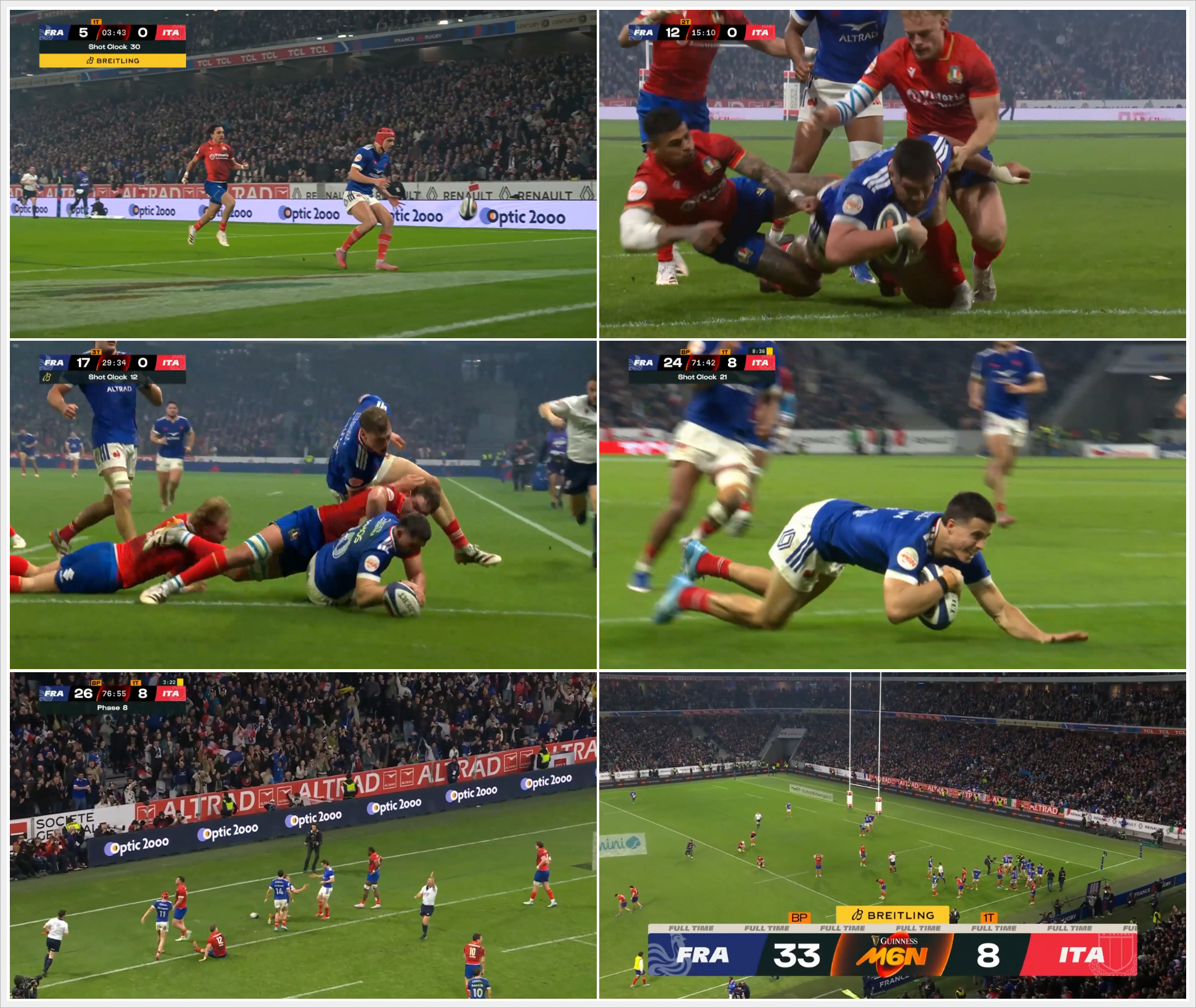 冬季オリンピックの開会式とのバッティングを避けるため、異例の木曜日の開幕となったこの試合。フランスは、ホームの大観衆の前で、スピード、パワー、正確性を兼ね備えた容赦ないプレーを見せつけ、試合の流れを掴むことすら困難なアイルランドを圧倒し、早々に主導権を確立した。