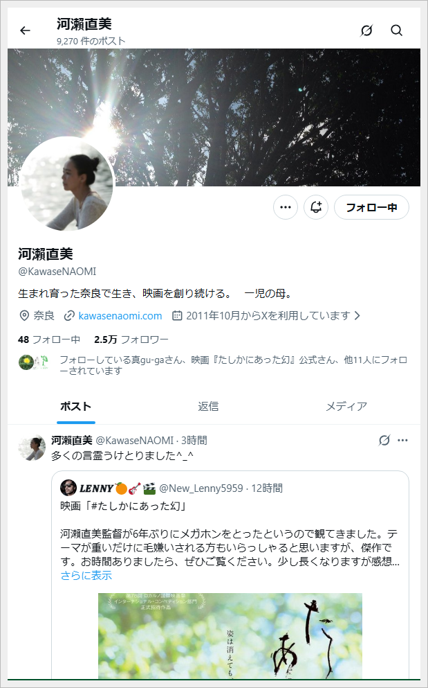 河瀬監督からリプ頂きました。