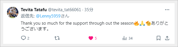 タタフのことは目黒学院時代に知って、東海大学に入ってから本格的に応援し始めた。私事で恐縮だが、自分がTwitterを始めたのが2013年1月。長年Twitterは見る専門だったけど、B&I Lions戦でタタフがダン・ビガーを吹っ飛ばしたのを観て、タタフの凄さを発信したくなり、2021年6月にタタフに関して人生初の投稿をした。タタフは自分のTwitterライフのきっかけ・恩人なのだ