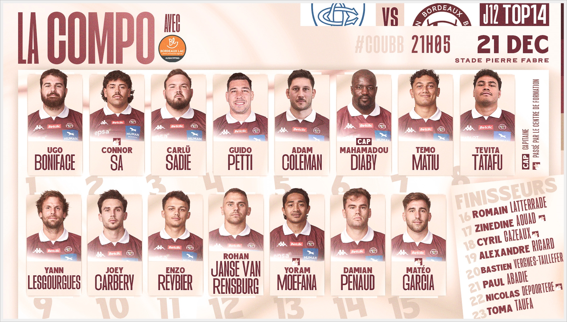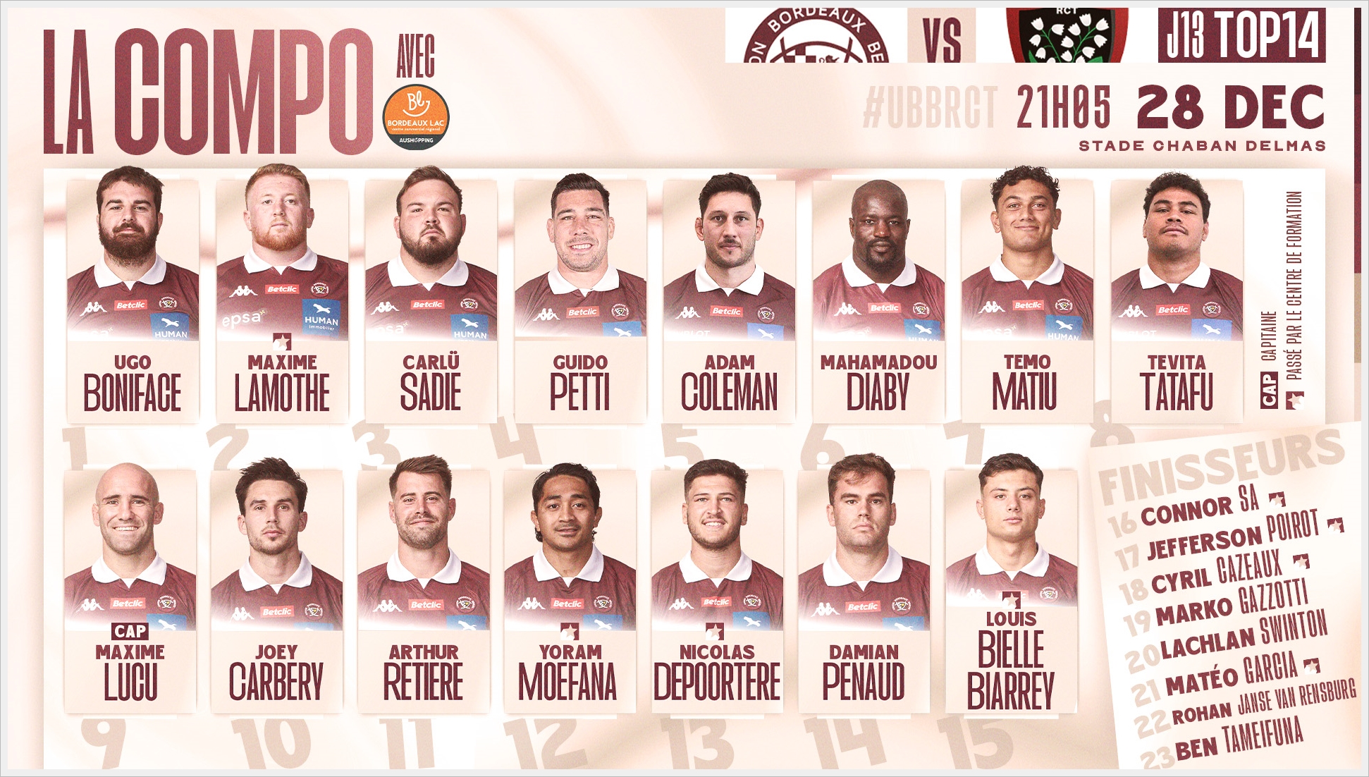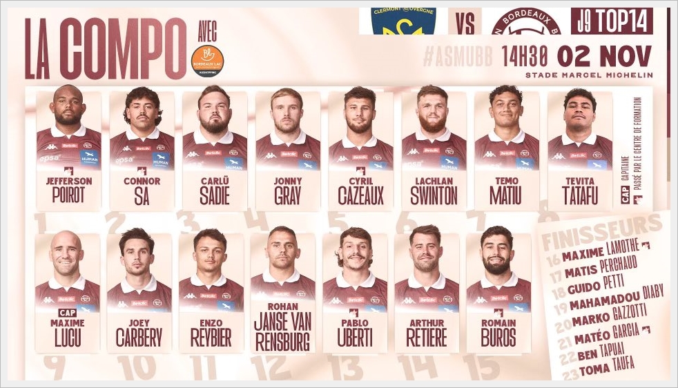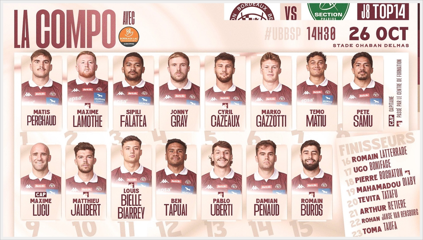 代表活動から戻ったタタフは控え。先発は先日フランス代表デビューを飾った、20歳の新鋭マルコ・ガゾッティ。そして第6節のペルミニャンのFWDアピサイ・ナカレブの反則タックルで眼底骨折の怪我を負ったCTBニコラ・ドゥポルテールが戻ってきたのは嬉しいNEWS。このせいでドゥポルテールはAutumn Nations Seriesに出れなかったからね。