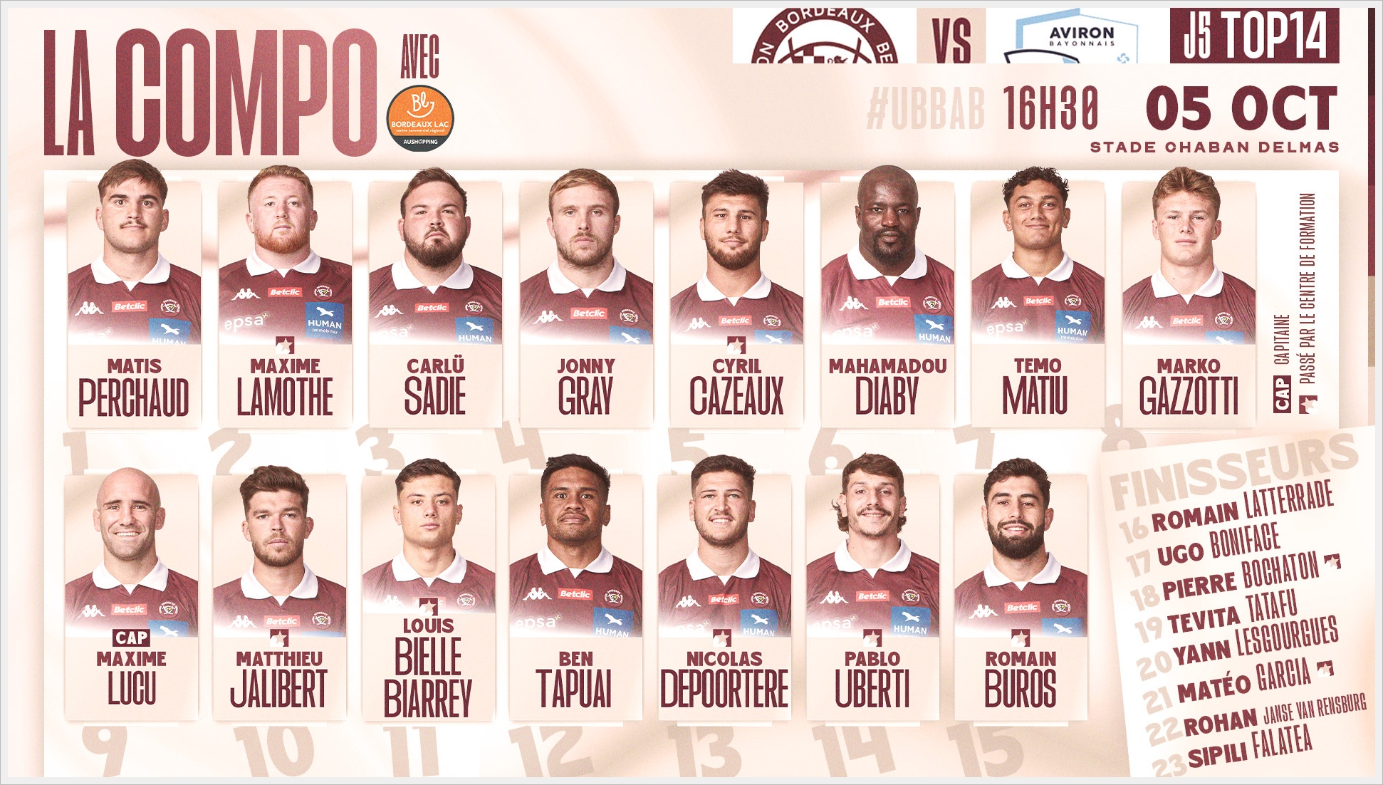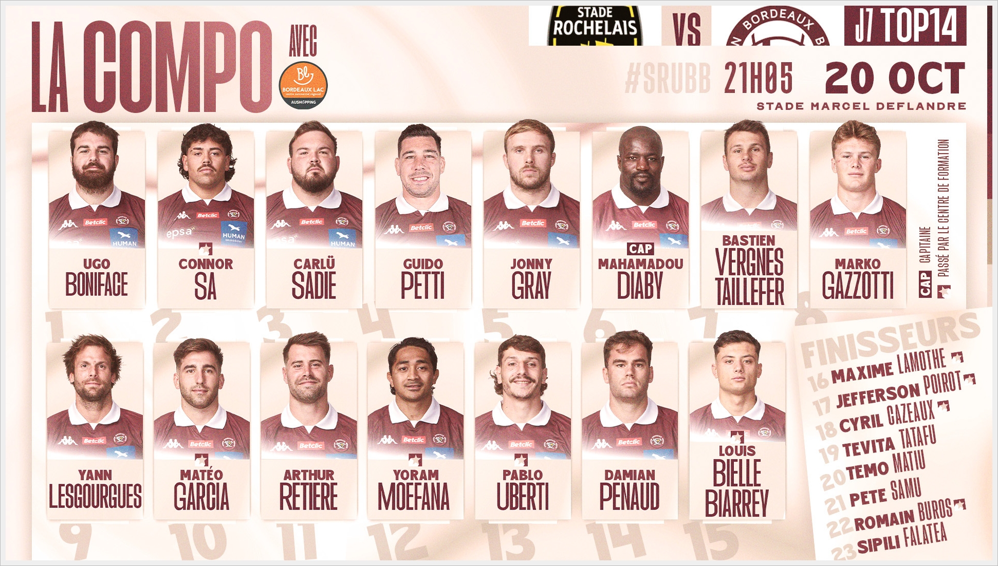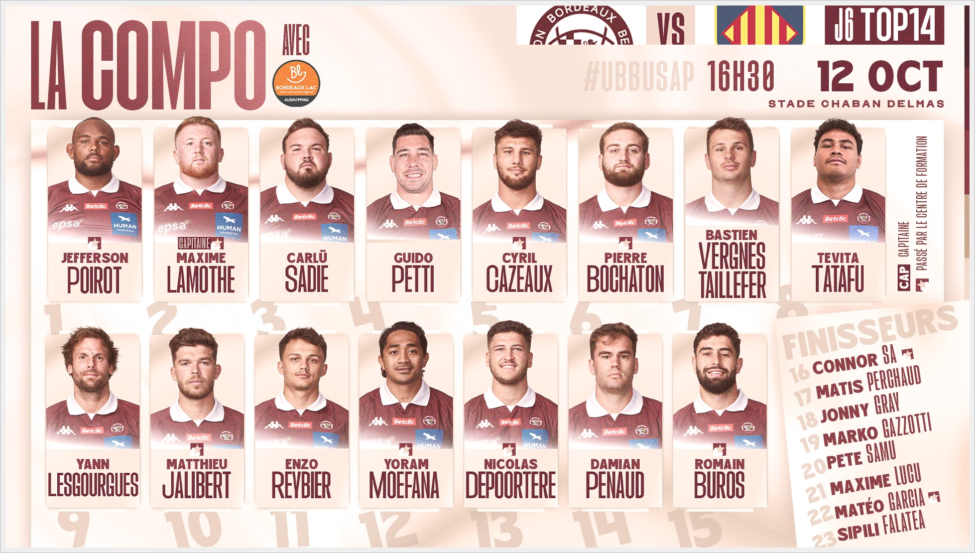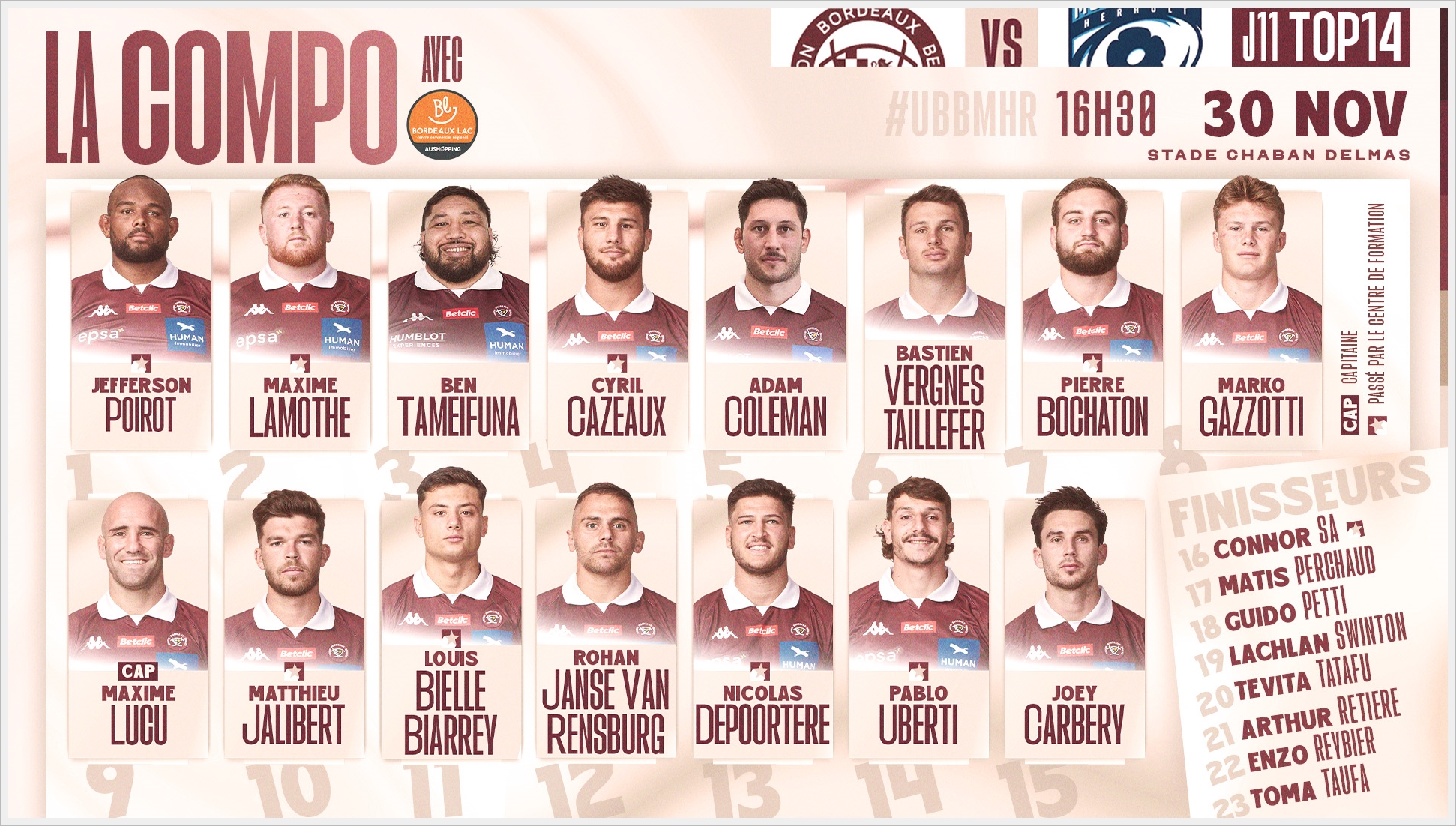代表活動から戻ったタタフは控え。先発は先日フランス代表デビューを飾った、20歳の新鋭マルコ・ガゾッティ。そして第6節のペルミニャンのFWDアピサイ・ナカレブの反則タックルで眼底骨折の怪我を負ったCTBニコラ・ドゥポルテールが戻ってきたのは嬉しいNEWS。このせいでドゥポルテールはAutumn Nations Seriesに出れなかったからね。