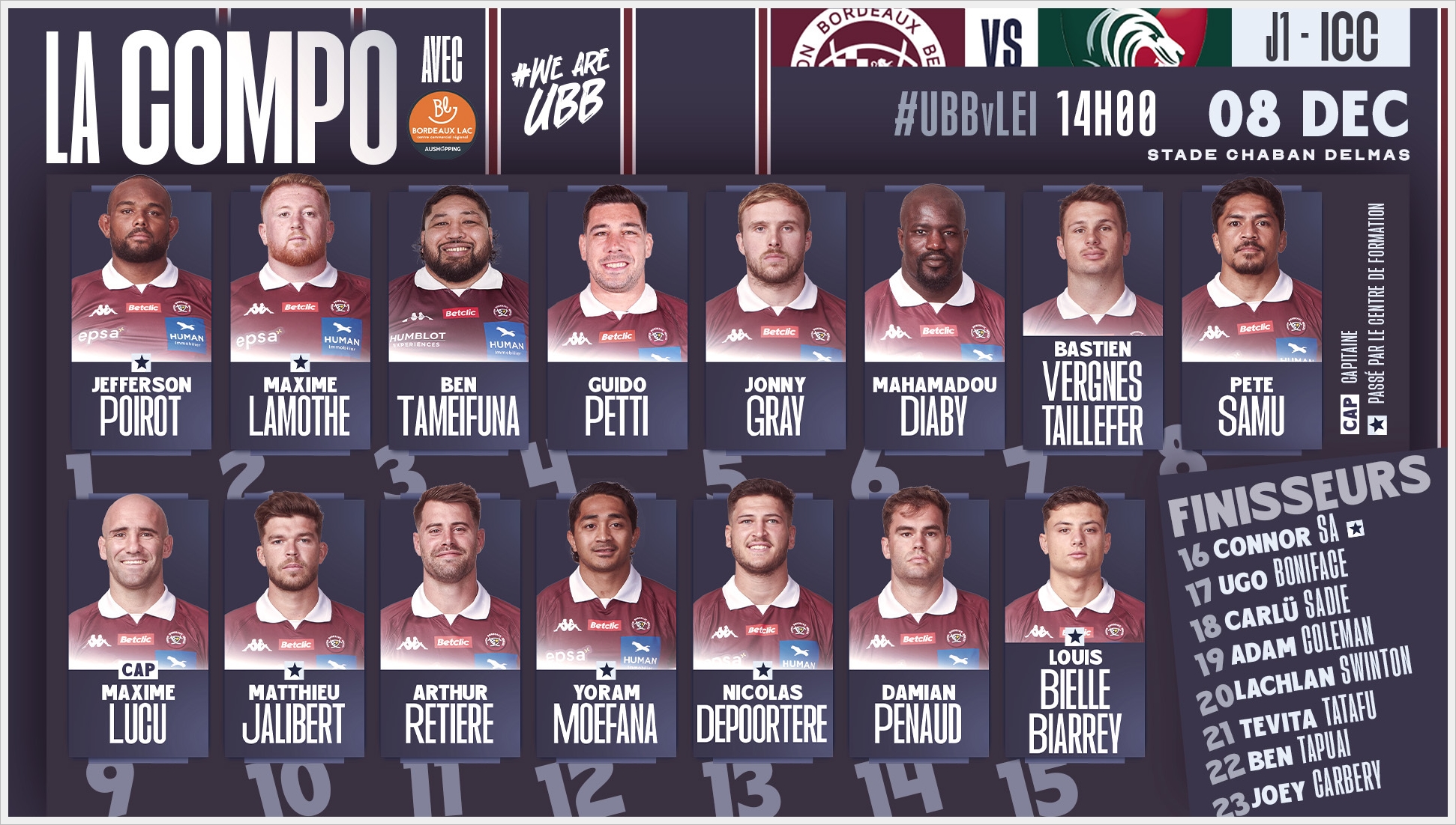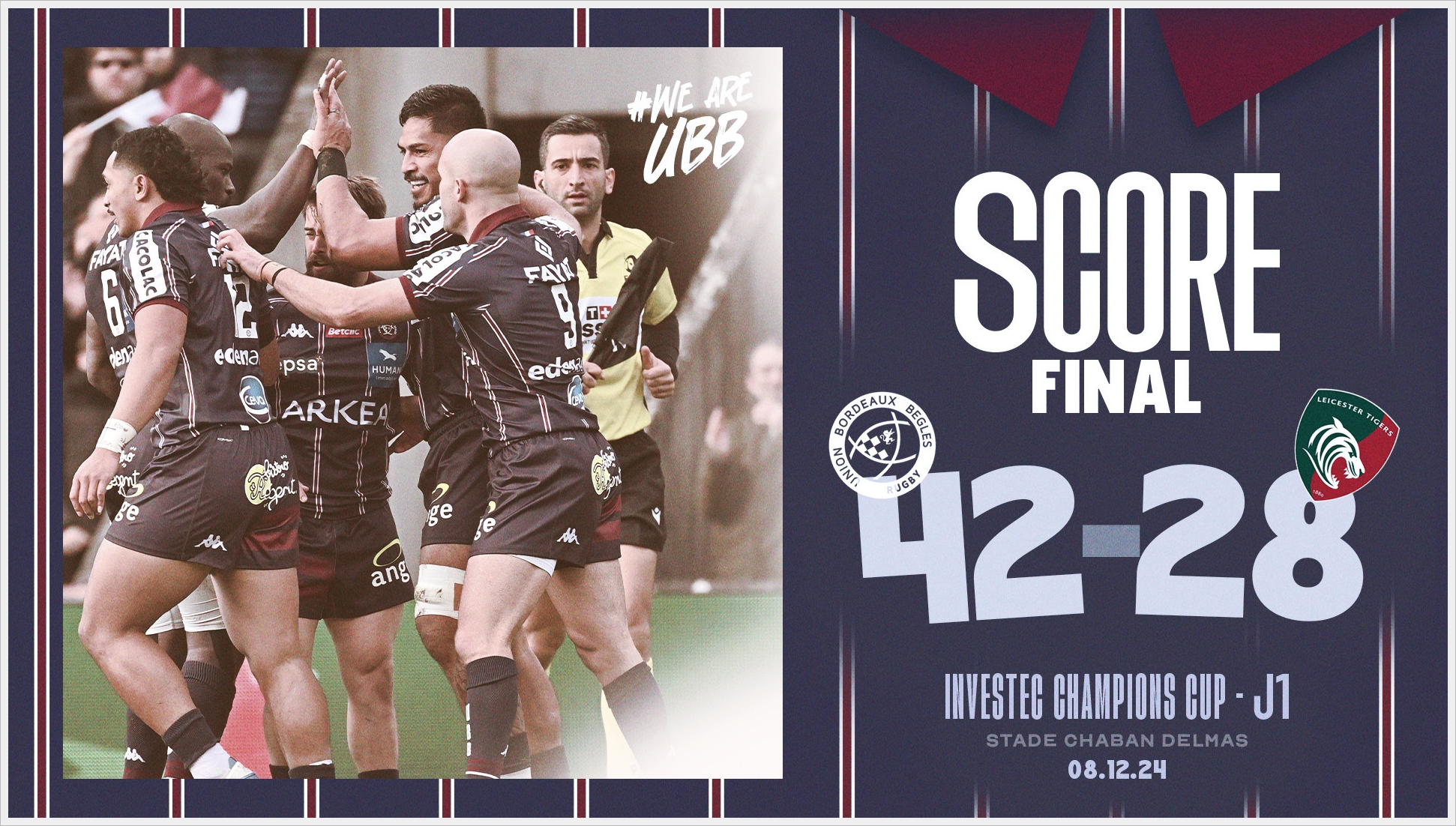前半は 14 -21 と今一つ波に乗れなかったボルドーだが、後半早々、今日はFBに入った赤い稲妻ルイ・ビエル=ビアレのトライで一気に波に乗った。45分にはNo.8ピート・サムの今日2つ目のトライ。48分には再びビエル=ビアレのトライで試合の趨勢を決めた。後半、レスターの攻撃を1トライのみに抑え、32,000人を超える大観衆の中でボルドーが好発進した。