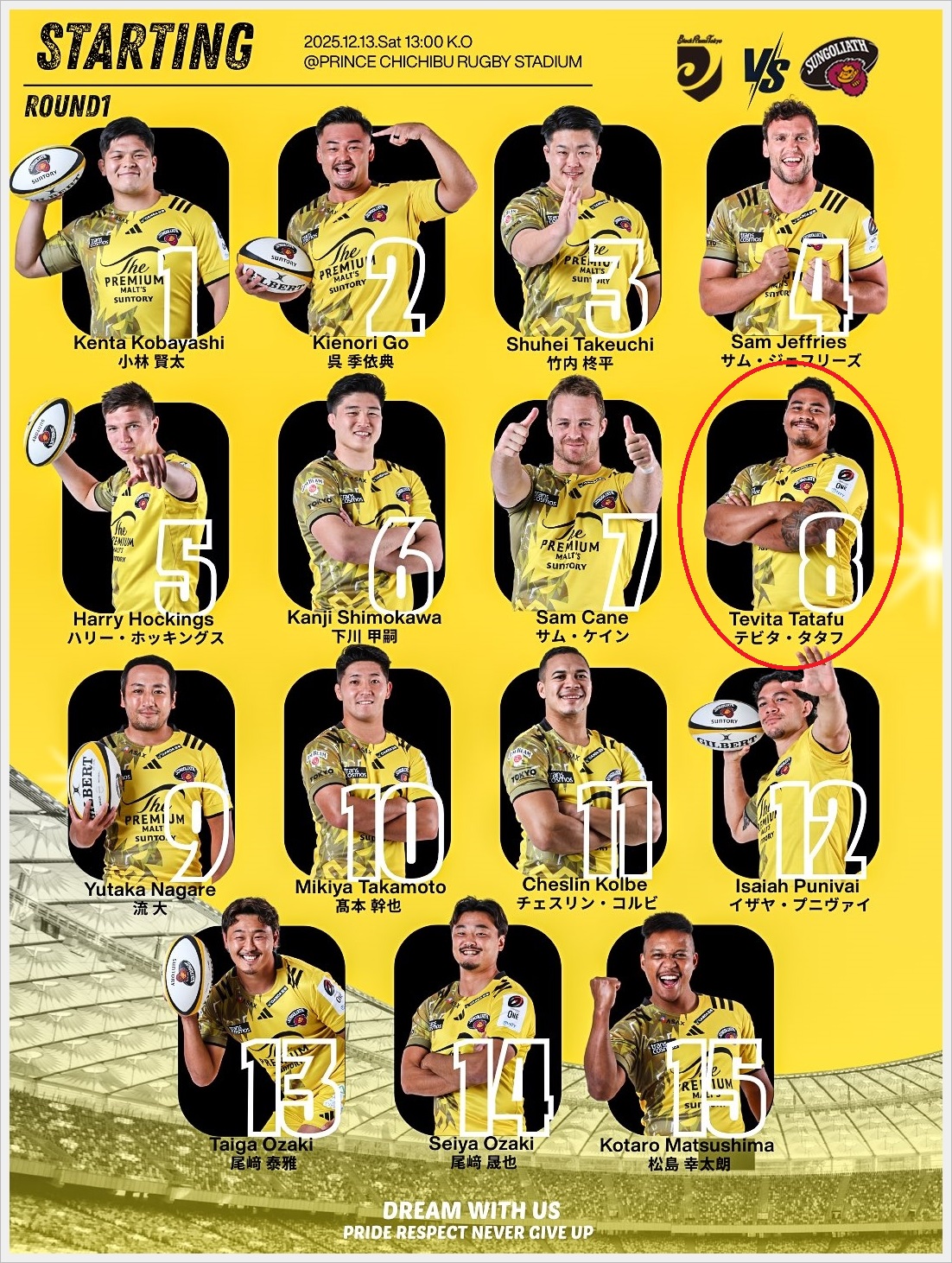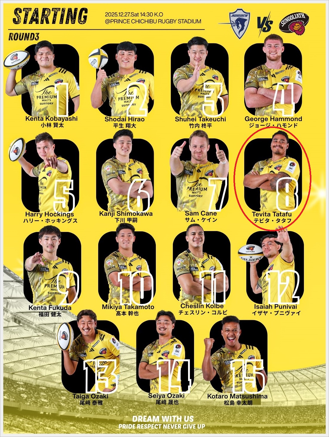 48分、タタフが106日ぶりにピッチに戻ってきた瞬間は泣きそうになった。タックルやキャリーと、特に怪我を感じさせない動きが嬉しかった。